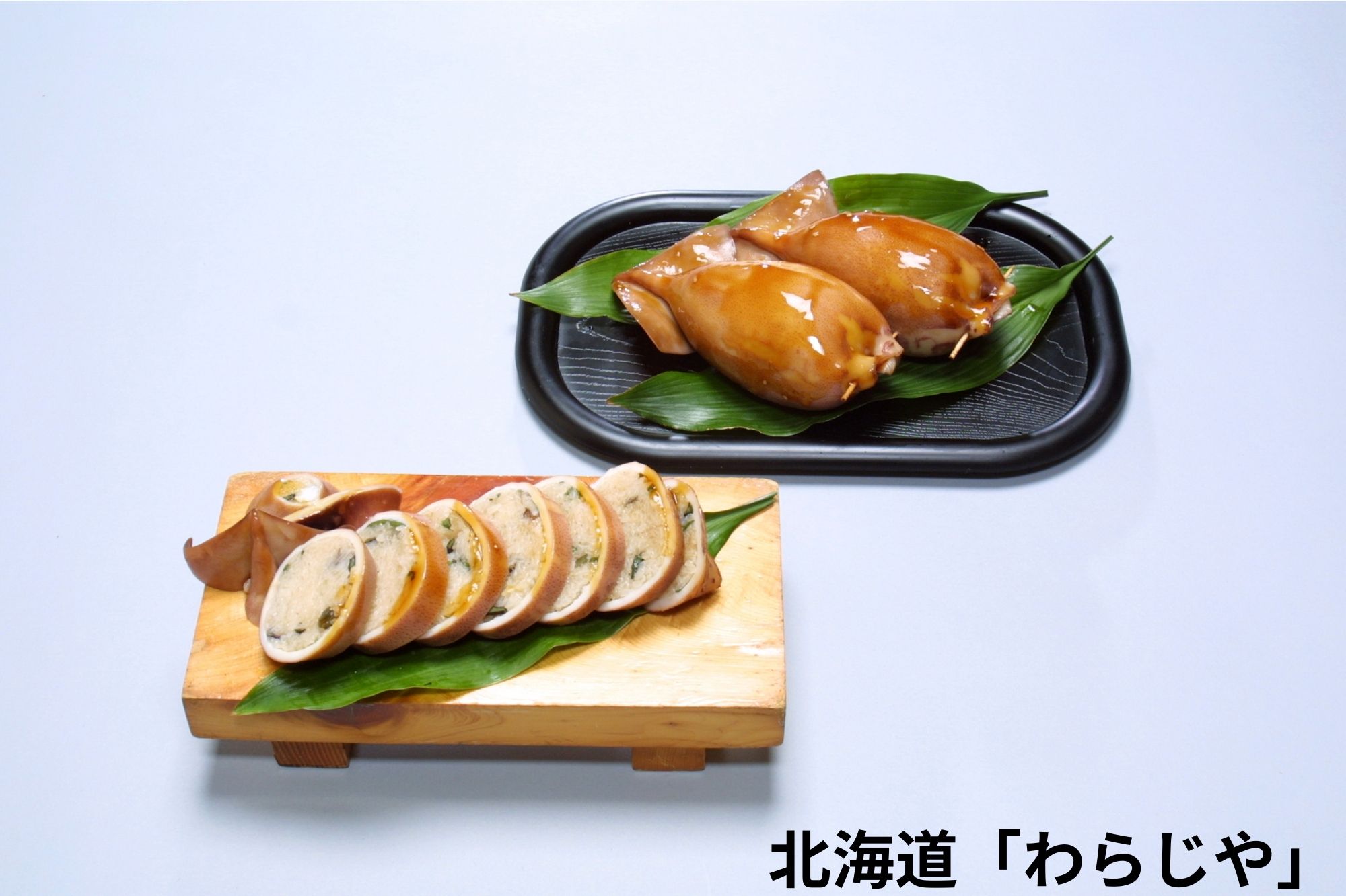 北海道「わらじや」・ジャンボいかめしいかの中に山菜おこわを詰めて、秘伝のタレで煮込みました。